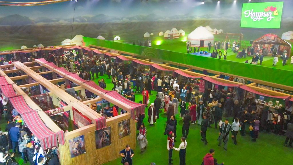 Здесь развернулась ежегодная восточная ярмарка «Наурыз базары», на которой представлены казахстанские товары от продуктов питания до текстиля по специальным праздничным ценам.