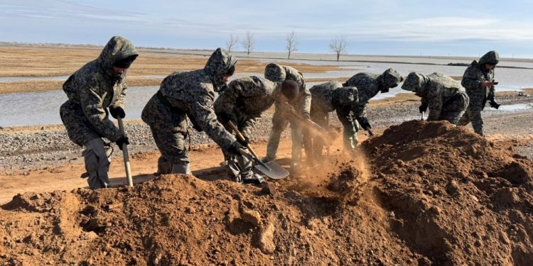 В поселке Шолаксор Актогайского района река вышла из русла со скоростью 50 кубометров в секунду. Как сообщает Optimism.kz, 50 военнослужащих воинской части 5512 Национальной гвардии тут же отправились в Актогайский район, чтобы помочь населенному пункту. Гвардейцы строят дамбы против талых вод и предпринимают все возможные меры, чтобы предотвратить наводнение. Фото: РгК «Шығыс» НГ РК.