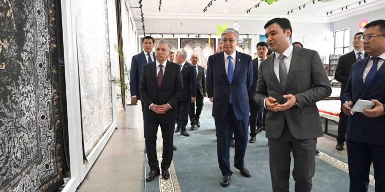 Президенты Казахстана и Узбекистана, Токаев и Мирзиёев, посетили ковроткацкую фабрику HIVA GILAMLARI в Хиве. Они ознакомились с производством и осмотрели различные цеха и шоу-рум. Важность создания экспортоориентированных предприятий в приграничных областях была подчеркнута. Также обсуждалась необходимость совместных усилий, включая улучшение экологической ситуации в регионе. Фото: Akorda.