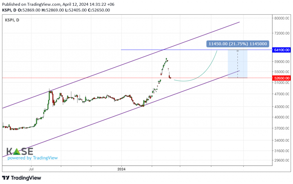 3. Компания-«единорог» Kaspi.kz (целевая цена – 64 100 тенге). Бумаги сочетают в себе удачный квартальный отчет, запас по фундаментальному росту и благоприятную техническую картину. Процентные доходы компании в четвертом квартале 2023 года составили 231 млрд тенге, увеличившись на 39% г/г и 6,3% к/к. Данные показатели дают новые абсолютные рекорды как в квартальном, так и в годовом выражениях. При этом котировки ГДР на LSE пробились вверх и вышли из застоя в боковом тренде, который длился с августа прошлого года. Это позитивный знак для долгосрочного растущего тренда.