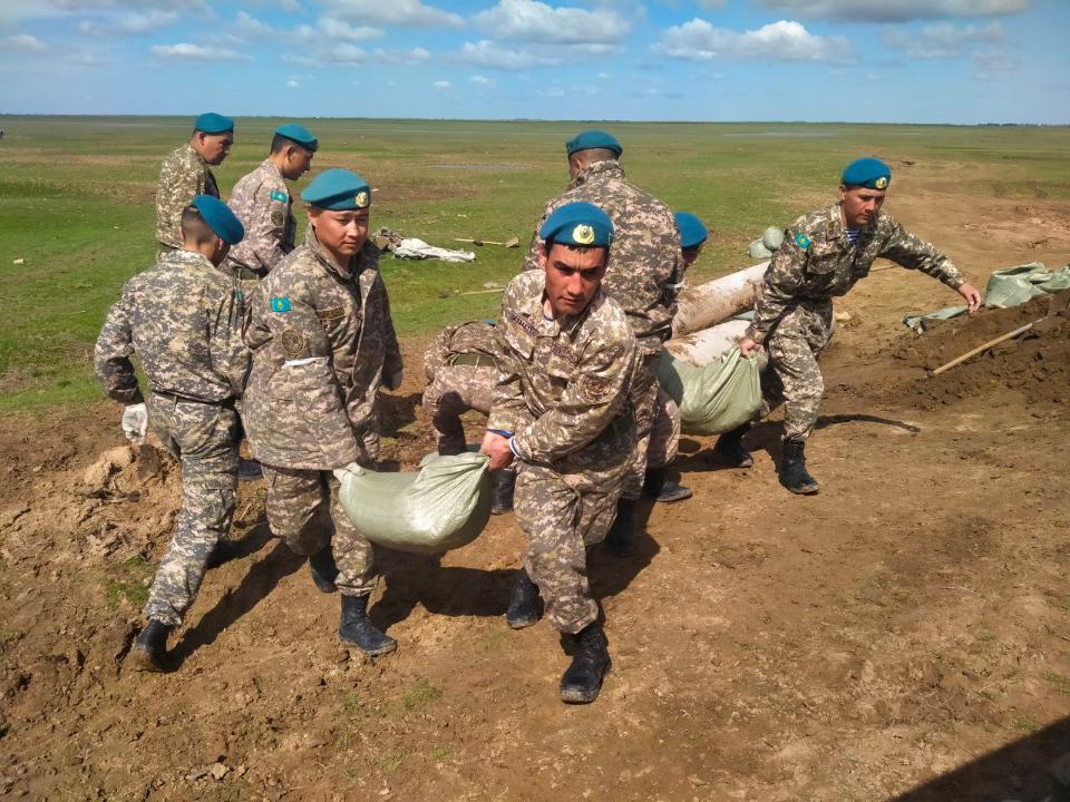 Более 300 десантников из Алматинского и Жетысуского гарнизонов приняли участие в противопаводковых мероприятиях в регионе, как сообщает Optimism.kz. Военнослужащие из воинских частей 61993 и 18404 были разделены на группы и направлены в районы, где имеется риск затопления населенных пунктов. В течение последних суток в селе Рубежинское Байтерекского района была построена дамба протяженностью 500 метров и высотой три с половиной метра, для чего было использовано 1850 мешков с песком и три рулона защитной пленки. В соседнем селе Подстепное было построено укрепительное сооружение длиной семьсот метров, высотой два с половиной метра, на это было использовано 110 метров целофановой пленки и более 3000 мешков с песком. В Акжайыкском районе военнослужащие 38-й десантно-штурмовой бригады продолжают работы в селах Жанабулак и Бударино под руководством майора Куаныша Калиева. Работы по укреплению берегов Урала также проводятся в селах Магистральное, Байконыс и Дарьинское. Фото: Пресс-служба Минобороны РК.