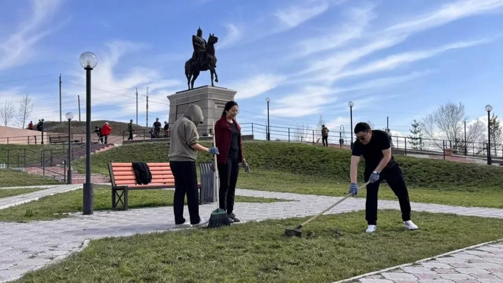 Массовый субботник в Усть-Каменогорске начался возле памятника Кабанбай Батыру, находящегося в черте города. Монумент высотой в шесть метров, открытый в 2014 году, создан Нурланом Далбаем. На нем изображен легендарный казахский полководец на боевом коне с копьем, передающий образ Кабанбай Батыра как символ единства казахского народа.