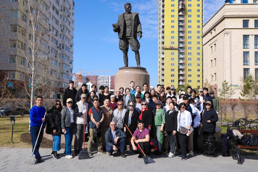 С раннего утра 19 апреля силами сотрудников культурных организации и воспитанников патриотического движения «Жас Сарбаз» была проведана уборка памятника герою Советского Союза, легендарному летчику Талгату Бегельдинову, который расположен по проспекту Сарыарка.