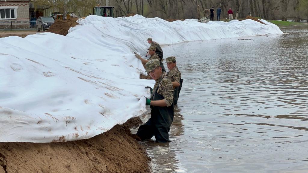 На реке Жайык сохраняется повышение уровня воды. Производится укладка мешкотары, возведение защитных дамб и откачка воды с подтопленной территорий.