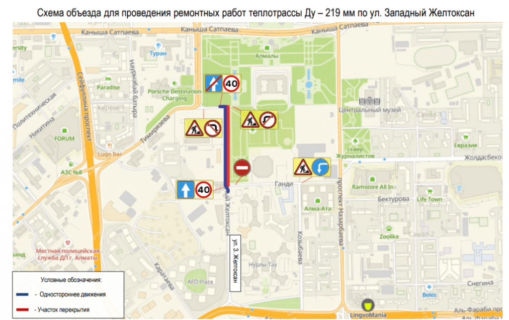 На время ремонтных работ трубопровода ежедневно с 07:00 до 22:00 движение для транспорта по улице Западный Желтоксан будет односторонним в северном направлении. С 22:00 до 07:00 ежедневно и в выходные дни движение будет перекрыто в обе стороны.