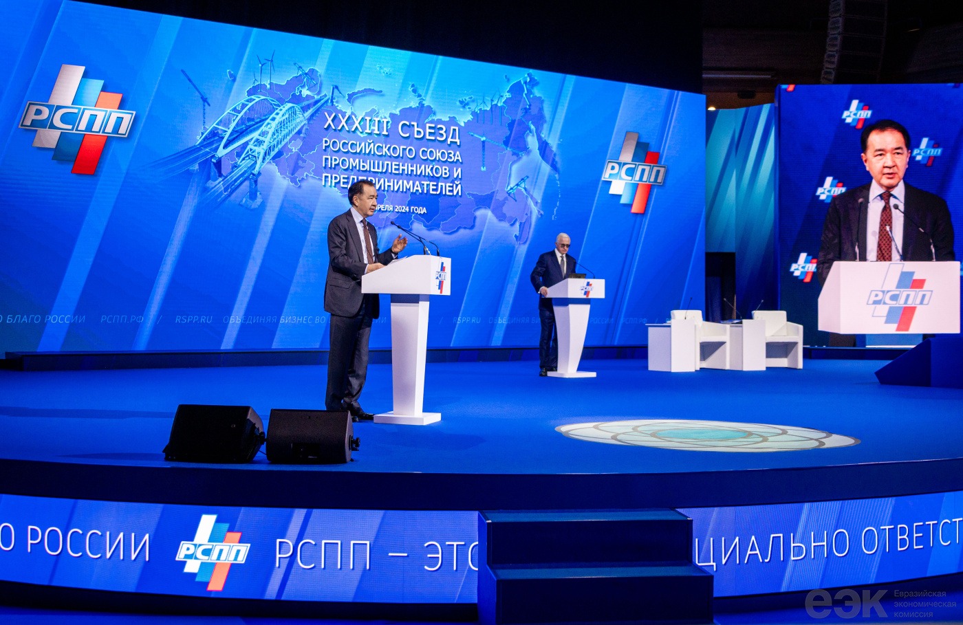 Председатель Коллегии Евразийской экономической комиссии Бакытжан Сагинтаев 25 апреля в Москве принял участие в съезде Российского союза промышленников и предпринимателей (РСПП), где отметил важную роль РСПП в реализации стратегического направления евразийской интеграции — развитие диалога между бизнес-сообществами государств Евразийского экономического союза. В своем выступлении он подчеркнул методы стимулирования предпринимательства в рамках ЕАЭС и поделился информацией о взаимодействии Коллегии с деловым сообществом стран-участниц союза. Он также обсудил финансирование проектов по промышленной кооперации и призвал бизнес-сообщество присоединиться к программе для создания конкурентоспособной продукции, соответствующей международным стандартам.