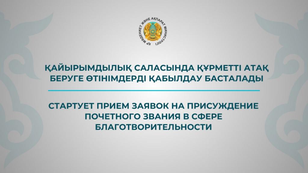 Министерство культуры и информации РК объявляет о старте приема заявок на присуждение почетного звания в сфере благотворительности.