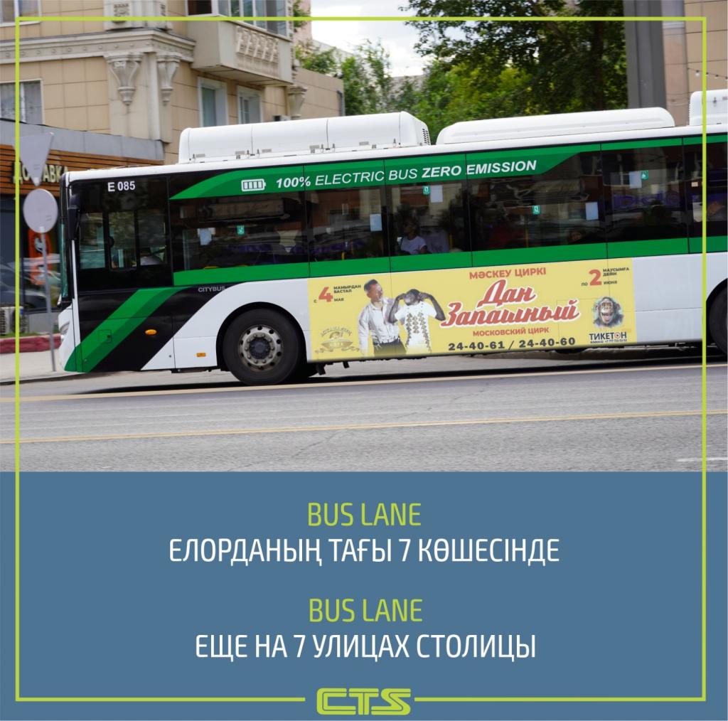 По данным CTS, в ближайшее время специальные полосы появятся по проспекту Тауелсиздик, ул. Керей Жанибек хандар, пр-ту Улы Дала, пр-ту Р. Кошкарбаева, ул. Ч. Айтматова.
