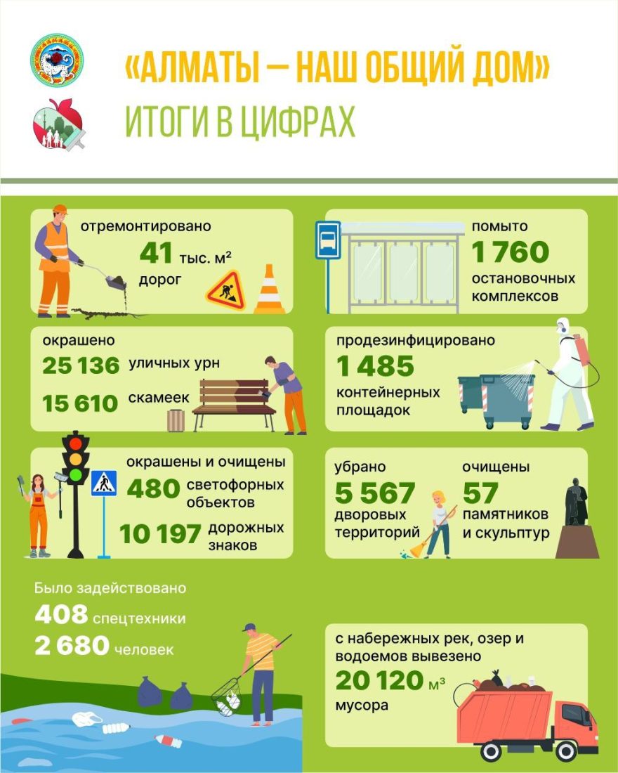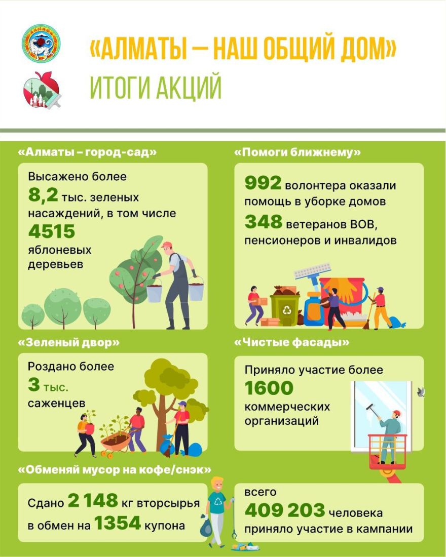 По поручению Главы государства о благоустройстве и озеленении территорий населенных пунктов в рамках акции «Таза Қазақстан» акиматом города Алматы с 8 апреля по 8 мая 2024 года реализована кампания «Алматы — наш общий дом». Основная цель кампании – формирование ценностей бережного отношения к городской инфраструктуре, воспитание высокой гражданской ответственности и экологической культуры среди населения.