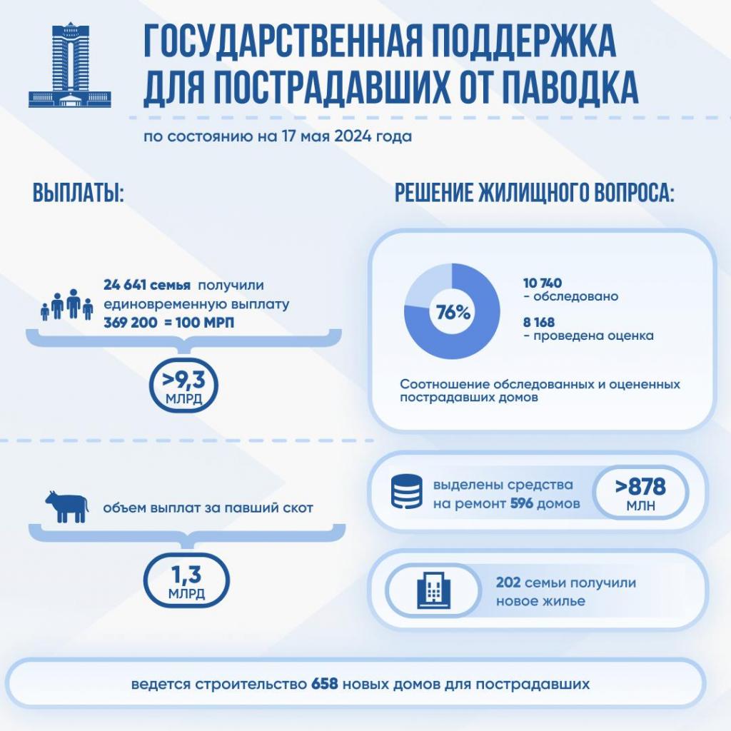 По состоянию на 17 мая 202 семьи уже получили дома и квартиры взамен разрушенного жилья. В Актюбинской, Западно-Казахстанской, Северо-Казахстанской и Павлодарской областях ведется строительство 658 новых домов для пострадавших граждан.