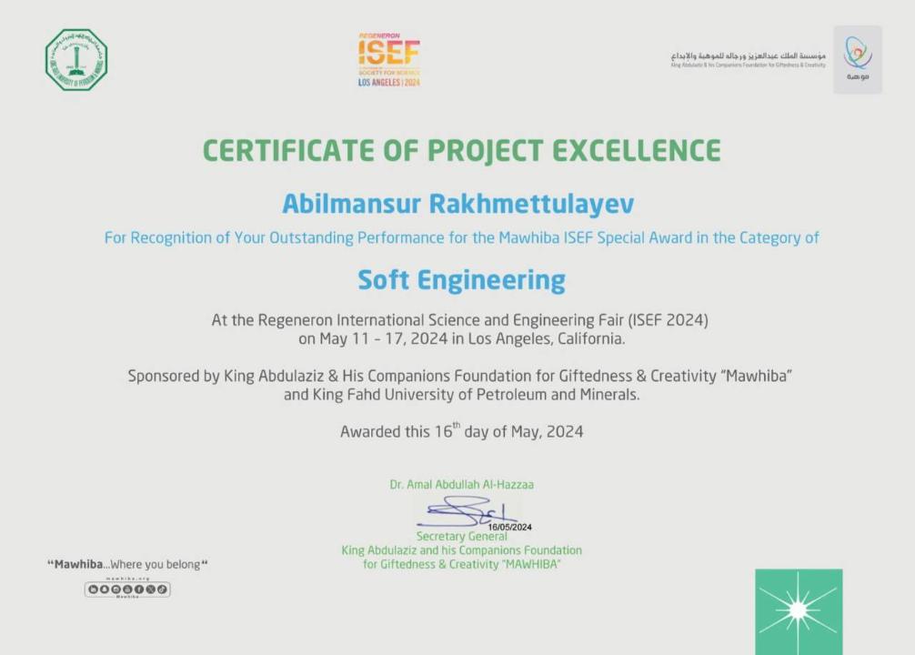 Абилмансур Рахметтуллаев, Саяжан Жаксыгалиева и Алихан Жарболов стали победителями в различных категориях и получили Дипломы за проект.