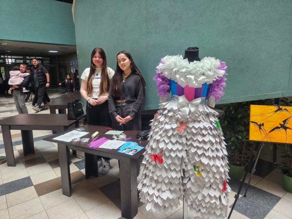 Ученица 6 класса школы-лицея №15 Томирис Есимова представила костюм, сшитый ей и ее мамой из подложки под ламинат “Зимняя принцесса”.