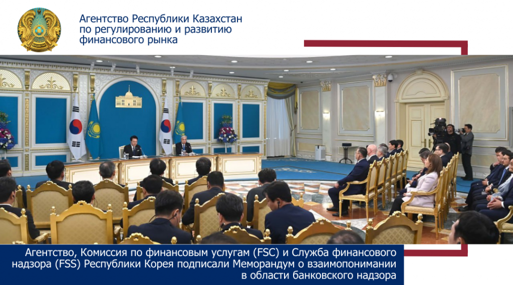 В рамках государственного визита Президента Республики Корея Юн Сок Ёля в Республику Казахстан между Агентством Республики Казахстан по регулированию и развитию финансового рынка, Комиссией по финансовым услугам (FSC) и Службой финансового надзора (FSS) Республики Корея подписан Меморандум о взаимопонимании в области банковского надзора.