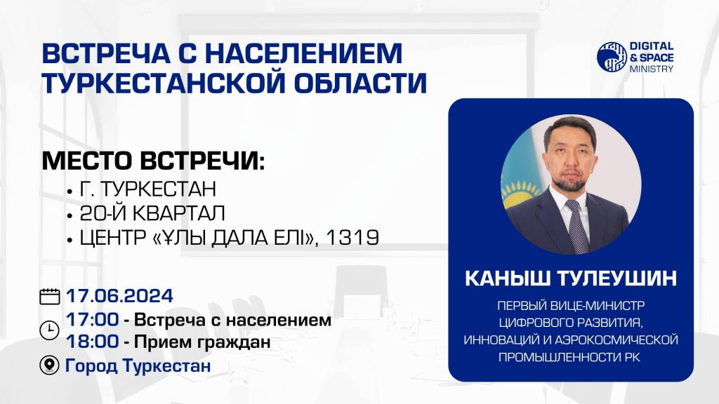 17 июня 17:00 часов Первый вице-министр цифрового развития, инноваций и аэрокосмической промышленности РК Каныш Тулеушин проведет встречу с населением Туркестанской области и в 18.00 часов проведёт прием граждан по вопросам, входящим в компетенцию Министерства в Центре «Ұлы Дала Елі» (адрес: г. Туркестан, 20-й квартал, 1319).