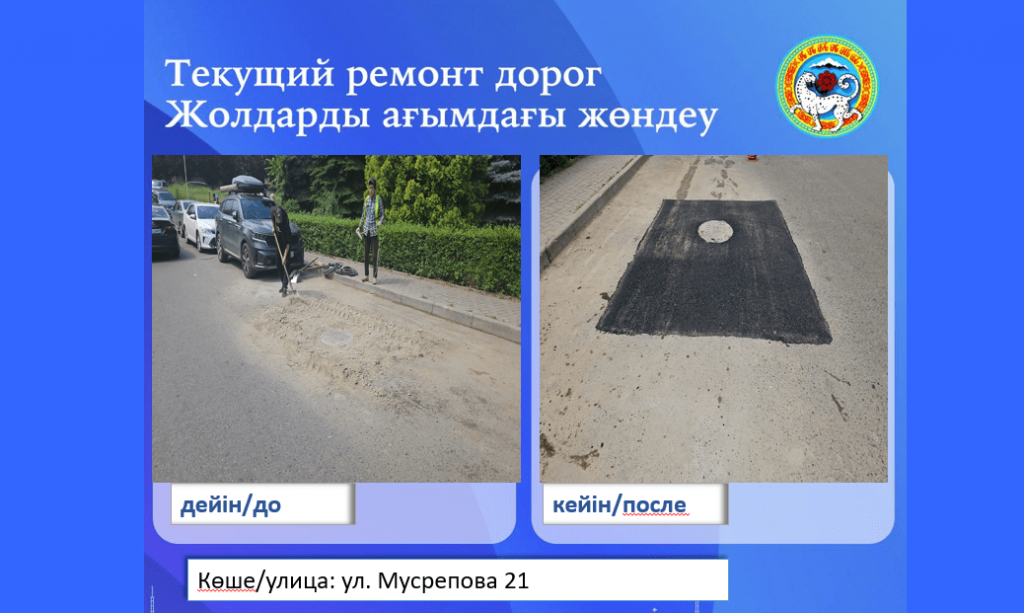 Уважаемые жители, при выявлении ям, выбоин, а также повреждений дорожного полотна можно обратиться в городской Telegram-чат акимата: @AlmatyJolybot