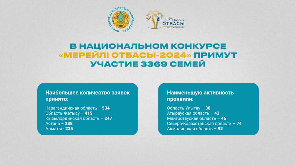 Завершился приём заявок на конкурс «Мерейлі отбасы-2024». В этом году побороться за звание самой образцовой семьи Казахстана намерены 3369 участников.