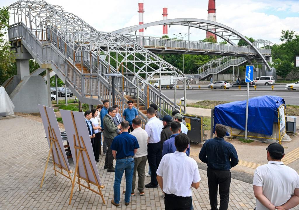 Аким Алматы Ерболат Досаев в ходе рабочего объезда ознакомился с ходом капитального ремонта одного из пяти надземных пешеходных переходов в Ауэзовском районе города.