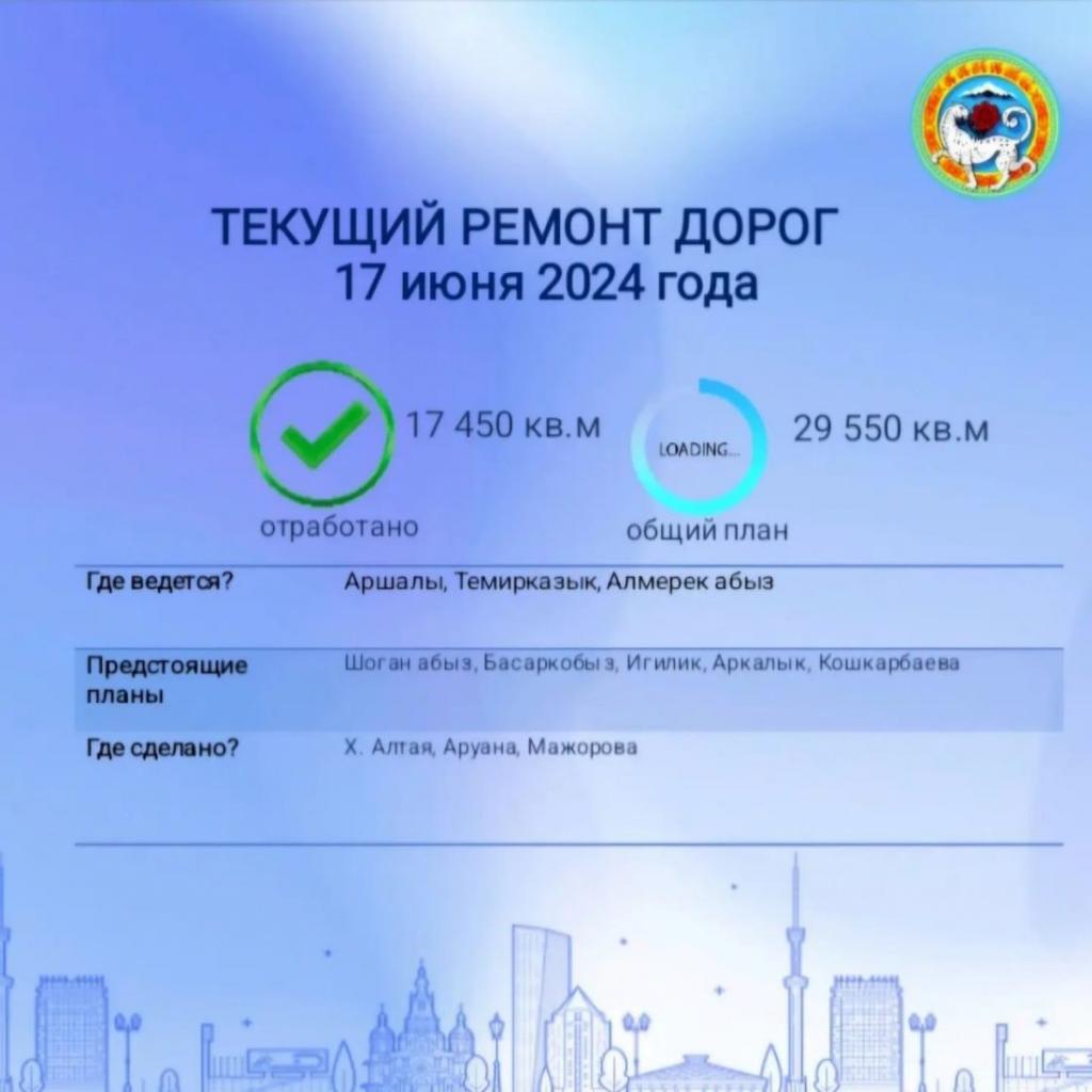 Текущие работы: – ул. Аршалы; – ул. Темирказык; – ул. Альмерек абыз.