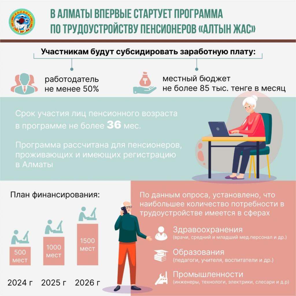 В Алматы впервые будет запущена программа «Алтын жас» – она предназначена для трудоустройства лиц пенсионного возраста. Как сообщил руководитель управления занятости и социальных программ мегаполиса Бауржан Жаубасов, в 2024 году охват составит не менее 500 человек, в 2025-м – 1 000 человек, в 2026 году – 1 500 человек.