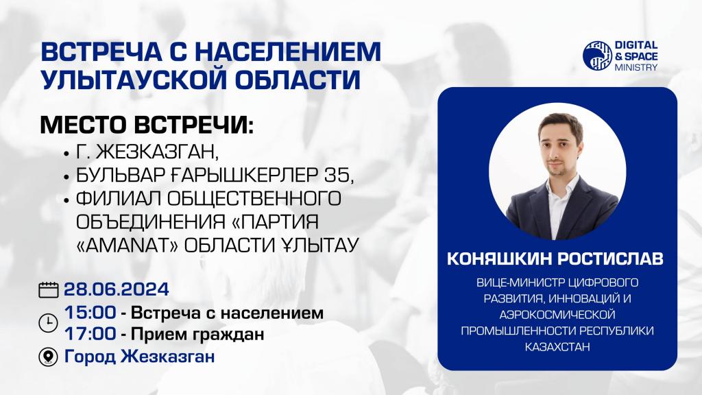 28 июня 15:00 часов вице-министр цифрового развития, инноваций и аэрокосмической промышленности РК Коняшкин Ростислав Анатольевич проведет встречу с населением Улытауской области и в 17.00 часов проведёт прием граждан по вопросам, входящим в компетенцию Министерства в здании Филиала общественного объединения «Партия «AMANAT» Улытауской области (адрес: г. Жезказган, бульвар Ғарышкерлер 35).