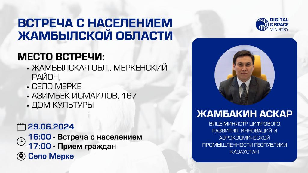 29 июня 16:00 часов Вице-министр цифрового развития, инноваций и аэрокосмической промышленности РК Аскар Жамбакин проведет встречу с населением Жамбылской области и в 17.00 часов проведёт прием граждан по вопросам, входящим в компетенцию Министерства в Доме культуры села Мерке (адрес: Жамбылская обл., Меркенский р-н, с. Мерке, Азимбек Исмаилов, 167).