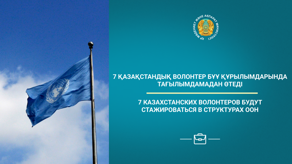 В рамках Соглашения между Министерством культуры и информации РК и Программой добровольцев ООН (ДООН) семь волонтеров – казахстанцев будут стажироваться в различных структурах ООН (UNFPA, UN Women, UNDP, UN ESCAP, IOM). Их отобрали на конкурсной основе из 266 кандидатов. В течение трех лет волонтерам предстоит трудиться в Кении, Таиланде и Турции.