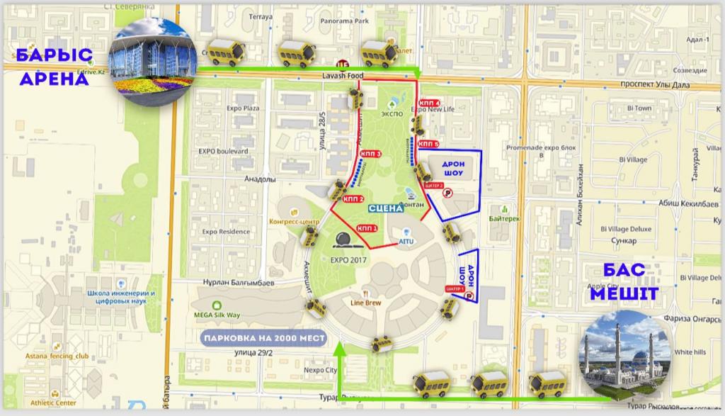 Адреса мест, где можно оставить автомобиль и пересесть на автобусы: парковка Бас мешіт (улица Мангилик Ел, 65) и парковка МЛД «Барыс Арена» (проспект Туран, 57).