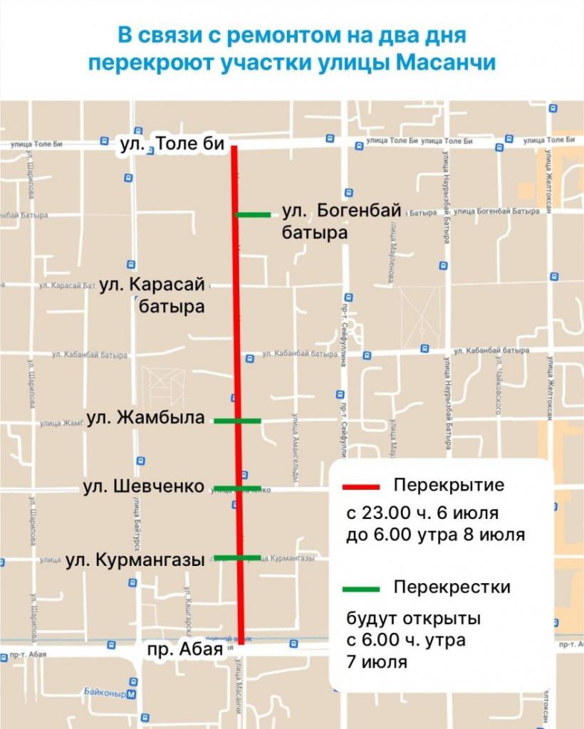 Так, с 23.00 6 июля до 6.00 8 июля движение будет перекрыто на участке от улицы Толе би до проспекта Абая. При этом движение на перекрестках с улицами Курмангазы, Шевченко, Жамбыла, Карасай батыра и Богенбай батыра будет открыто с 6.00 7 июля.