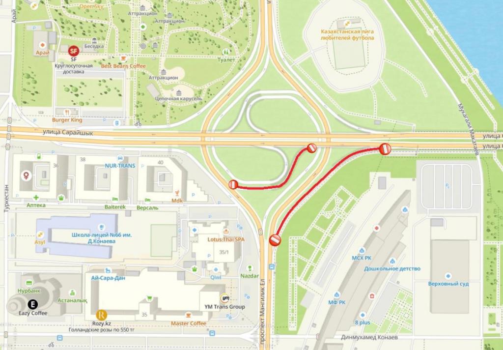 В связи с чем с 11 по 25 июля текущего года вышеуказанный участок будет полностью перекрыт (правосторонние съезды с пр. Мангилик Ел на пр. Кошкарбаева). При этом движение автотранспортных средств будет осуществляться по прилегающим улицам Акмешит и Туркестан.