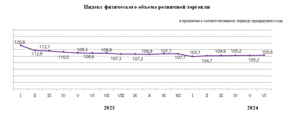 Индекс физического объема в торговле в январе-июне 2024 г. к соответствующему периоду прошлого года составил 103,9%.