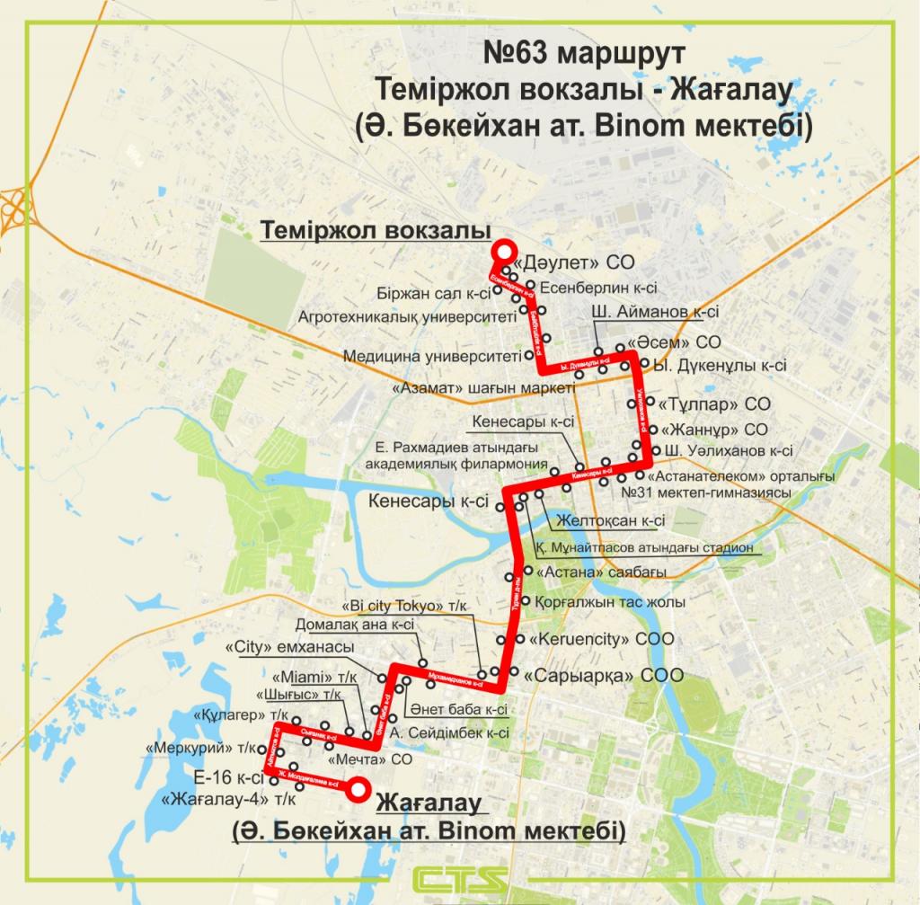 Маршрут будет курсировать сообщением «Железнодорожный вокзал» – Жагалау (Школа Binom им. А. Бокейхана). Он охватит Агротехнический и Медицинский университеты, ТРЦ «Сарыарка», «Keruencity», район рынка «Астаналық», ТЦ «Тұлпар», ТД «Шапағат», «Асем» и «Сарыарка».