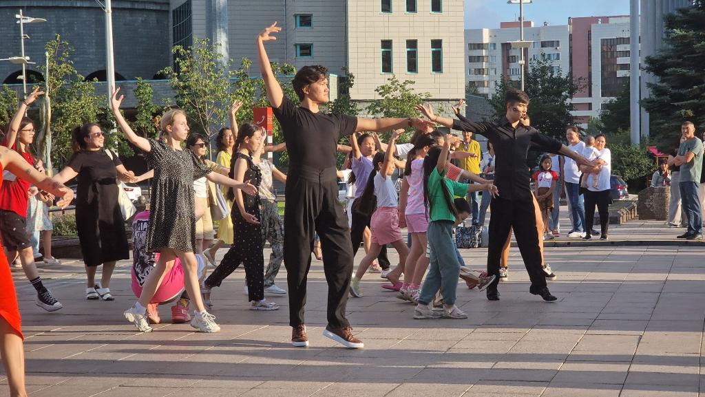 Профессионалы студии танца Sky Dance обучили желающих основам танца — от разминки до базовых движений. Астанчане и гости города могли научиться танцевать самбу, джайв, пасадобль, румбу и ча-ча-ча.