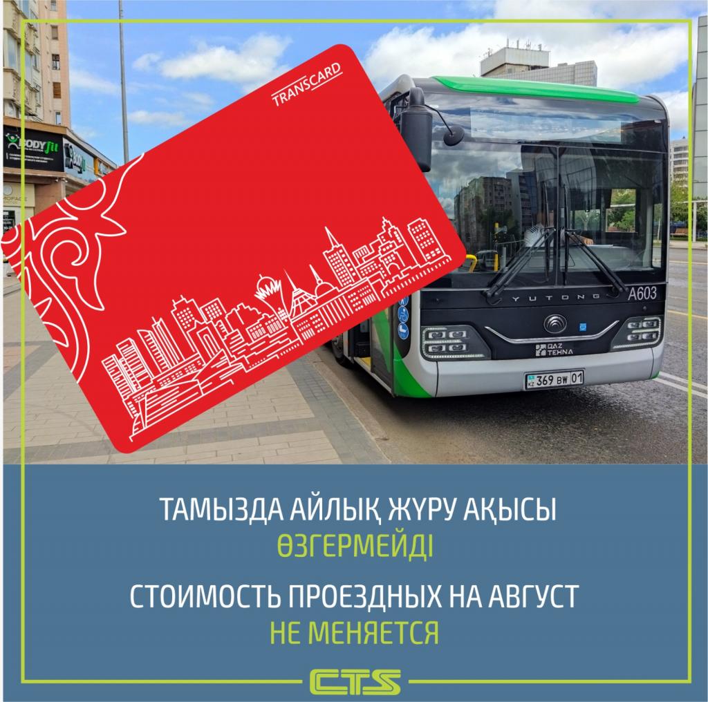 В связи с повышением проезда в общественном транспорте Астаны в августе цена на проездные длительного пользования – месячный, трехмесячный, — а также суточные не меняется, передает официальный сайт акимата столицы со ссылкой на CTS.