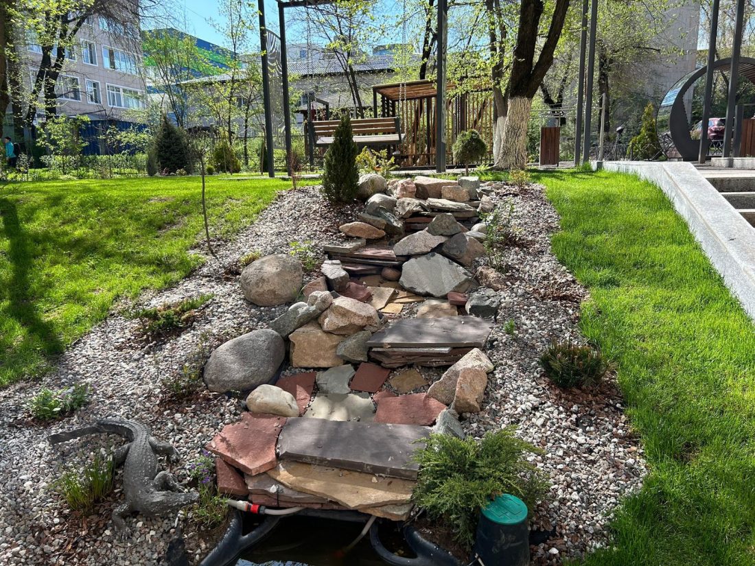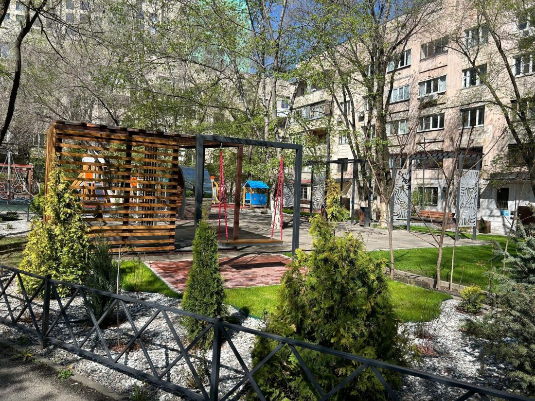 После того как заявка была одобрена, по заказу акимата Алмалинского района в 2023 году подрядчиком во дворе было установлено освещение, резиновое покрытие, обустроена альпийская горка, появилась брусчатка, был озеленен двор, установлены МАФы и заработал автополив.