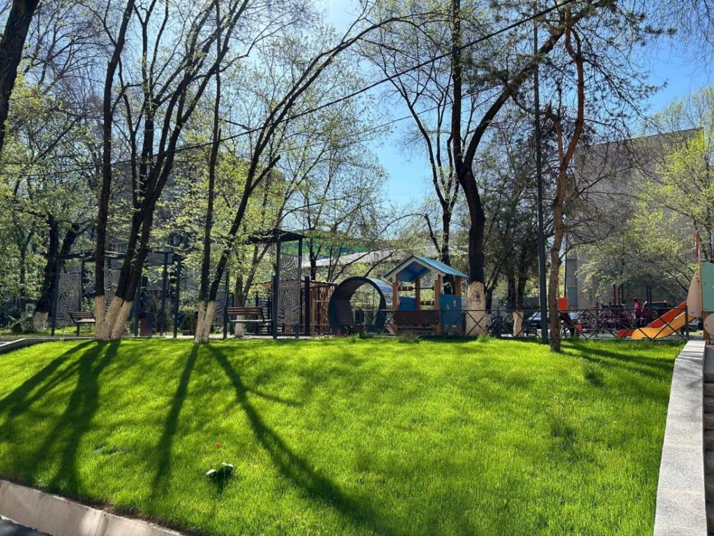 После того как заявка была одобрена, по заказу акимата Алмалинского района в 2023 году подрядчиком во дворе было установлено освещение, резиновое покрытие, обустроена альпийская горка, появилась брусчатка, был озеленен двор, установлены МАФы и заработал автополив.