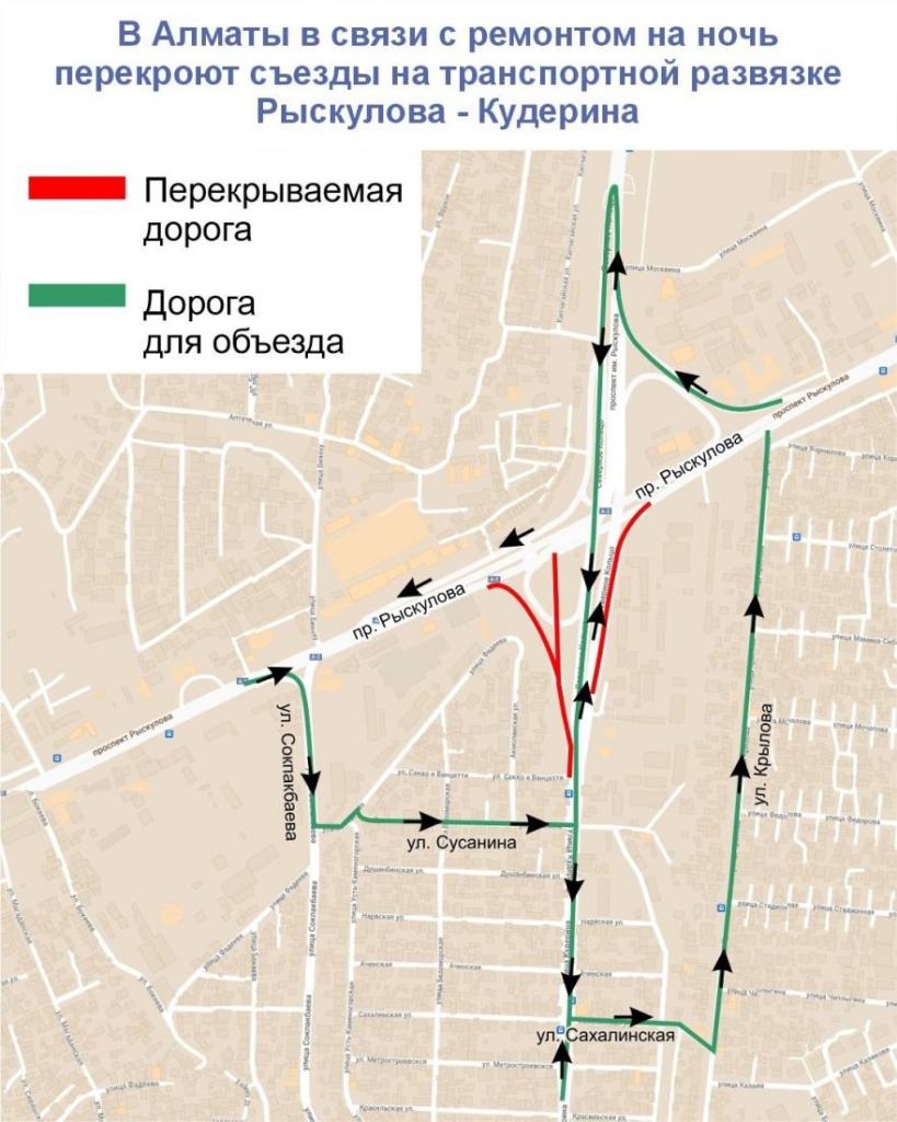 Так, с 23.00 24 июля до 6.00 25 июля движение будет перекрыто на съездах с южной стороны проспекта Рыскулова.