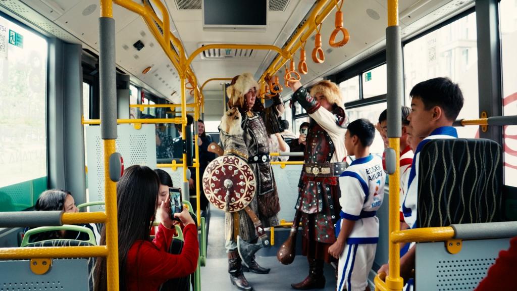 В автобусах пассажиры уже могли увидеть батыров в полной экипировке, беркутчи и многих других. Они проехались по городу на специально оформленном автобусе.