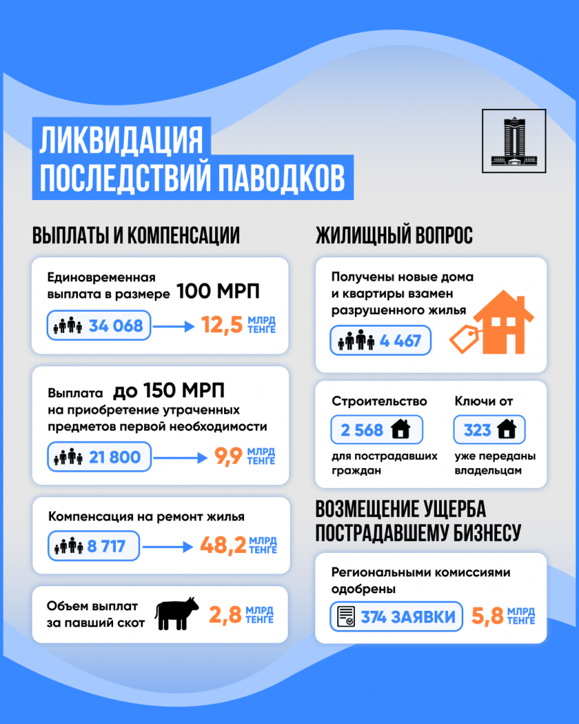 34 068 семьям выплатили единовременную компенсацию в размере 100 МРП. Всего на эти цели было направлено свыше 12,5 млрд тенге. По мере завершения оценки также осуществляются дополнительные выплаты для приобретения утраченных предметов первой необходимости в размере до 150 МРП. На сегодня 21 800 семей получили соответствующие компенсации на общую сумму 9,9 млрд тенге.
