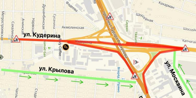 Так, с 23.00 28 июля до 23.00 29 июля движение будет полностью перекрыто по ул. Кудерина в северном направлении от ул. Сахалинской до конца тоннеля, съезд с пр. Рыскулова в западном направлении, съезд на ул. Северное кольцо в восточном направлении, разворот с южного направления.