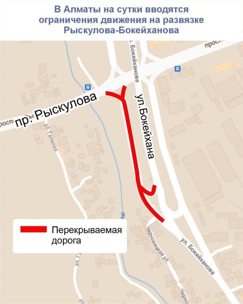 Так, с 23:00 31 июля до 23:00 1 августа движение будет полностью перекрыто движение на съезде в восточном направлении с пр.Рыскулова на ул.Бокейхана, а также с южного направления движения по ул.Бокейханова будет закрыт разворот и выезд на пр.Рыскулова в восточном направлении.