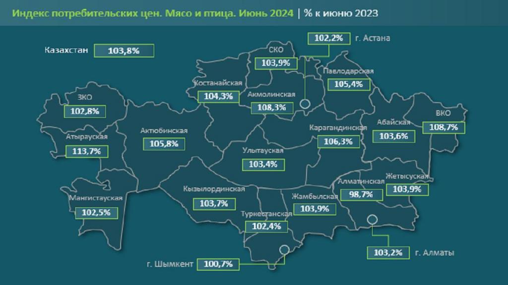 В региональном разрезе наибольший годовой рост цен на мясо и птицу был зафиксирован в Атырауской области: на 13,7%. Далее идут Восточно-Казахстанская (на 8,7%), Акмолинская (на 8,3%), Карагандинская (на 6,3%) и Актюбинская (на 5,8%) области. Наименьшее годовое удорожание было отмечено в Шымкенте: на 0,7%. Тем временем в Алматинской области мясо и птица подешевели на 1,3% за год.