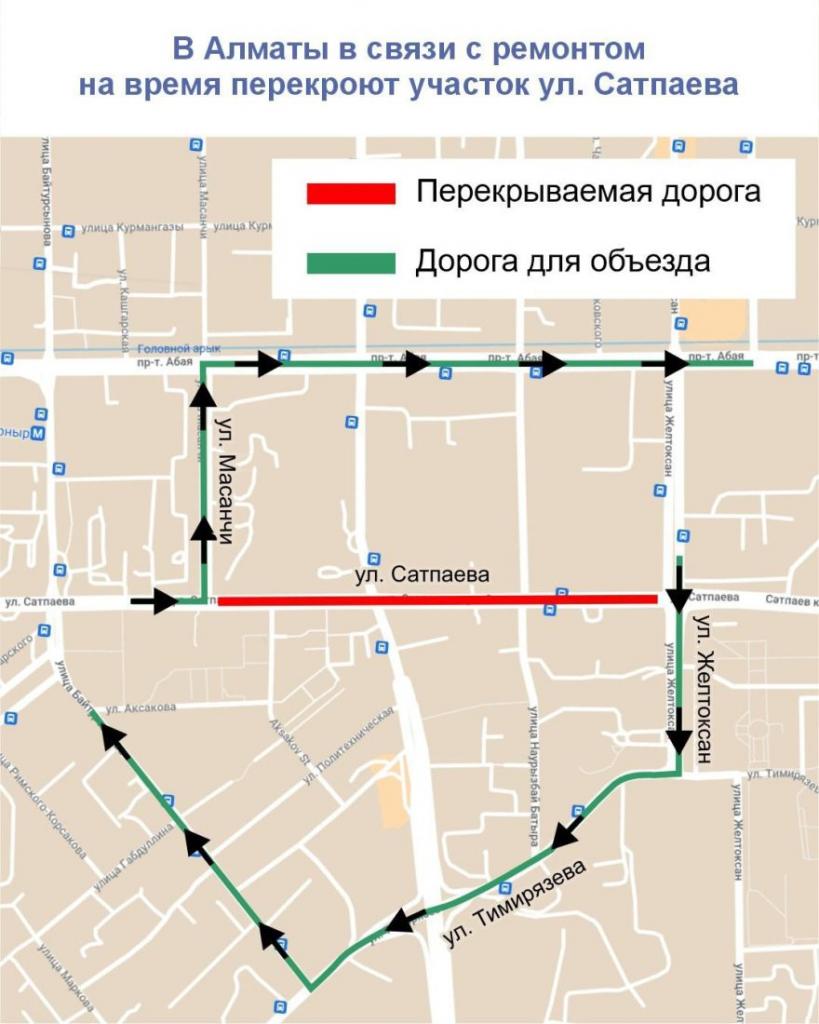 Объезд будет обеспечен в восточном направлении по ул. Масанчи и пр. Абая. В западном направлении по ул. Желтоксан и пр. Тимирязева.