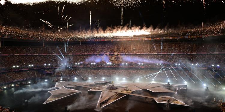 Глава МОК вместе с французским пловцом Маршаном и спортсменами с разных континентов Михаином Лопесом, Элиудом Кипчоге, Синди Нгамбой, Тедди Риннером, Эммой Маккион, Сунь Инша задули олимпийский огонь.