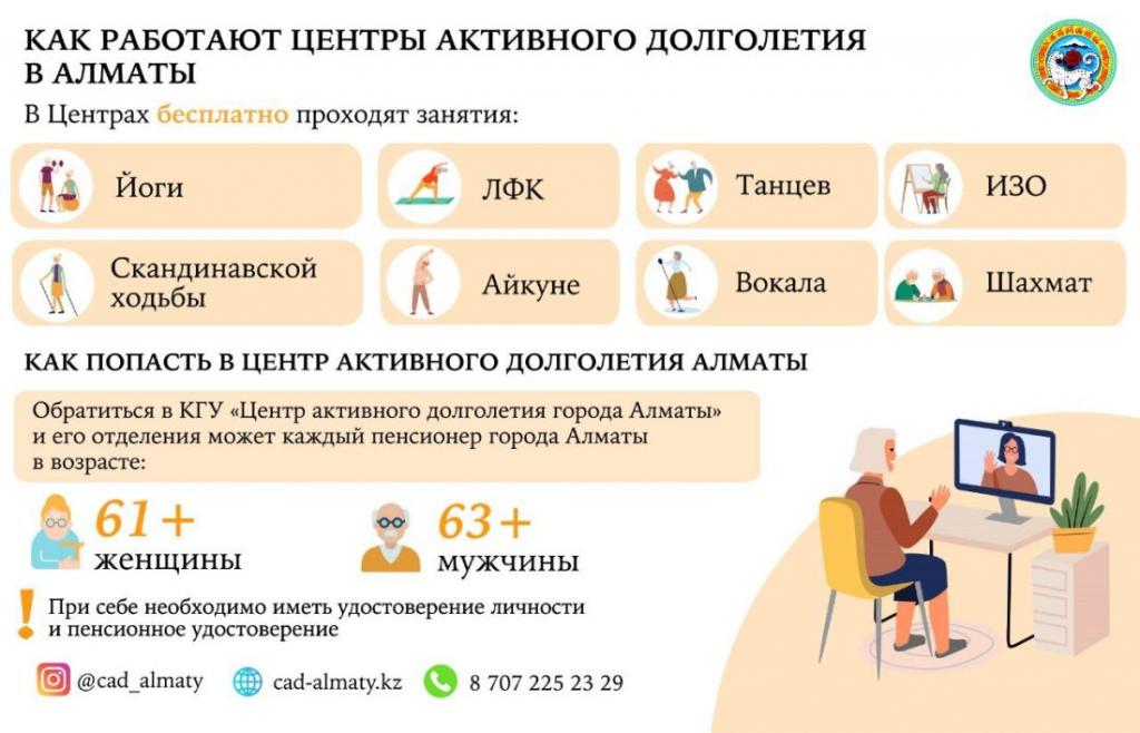 Обратиться в КГУ «Центр активного долголетия города Алматы» и его отделения может каждый пенсионер города Алматы (61+ женщины и 63+ мужчины). При себе необходимо иметь удостоверение личности и пенсионное удостоверение. Запись, занятия и консультации проводятся по нижеуказанным адресам:
