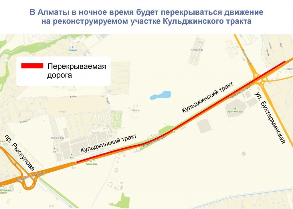Так, с 17 августа до 22 августа движение буде перекрываться в ночное время на участке от улицы Бухтарминской до пр. Рыскулова (в сторону города).