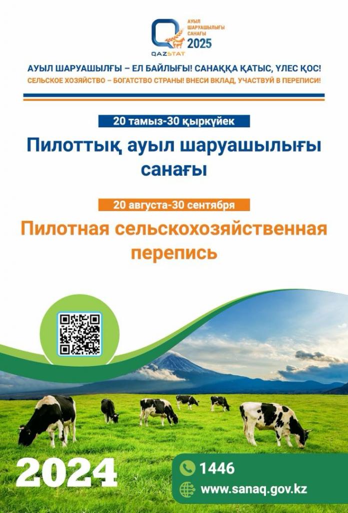 В пилотной переписи планируется охватить 29 тысяч домашних хозяйств и 8 тысяч хозяйствующих субъектов. Для получения консультаций по вопросам сельхоз переписи можно обратиться в контакт-центр по номеру 1446 или бот в телеграм statgovkz_bot.