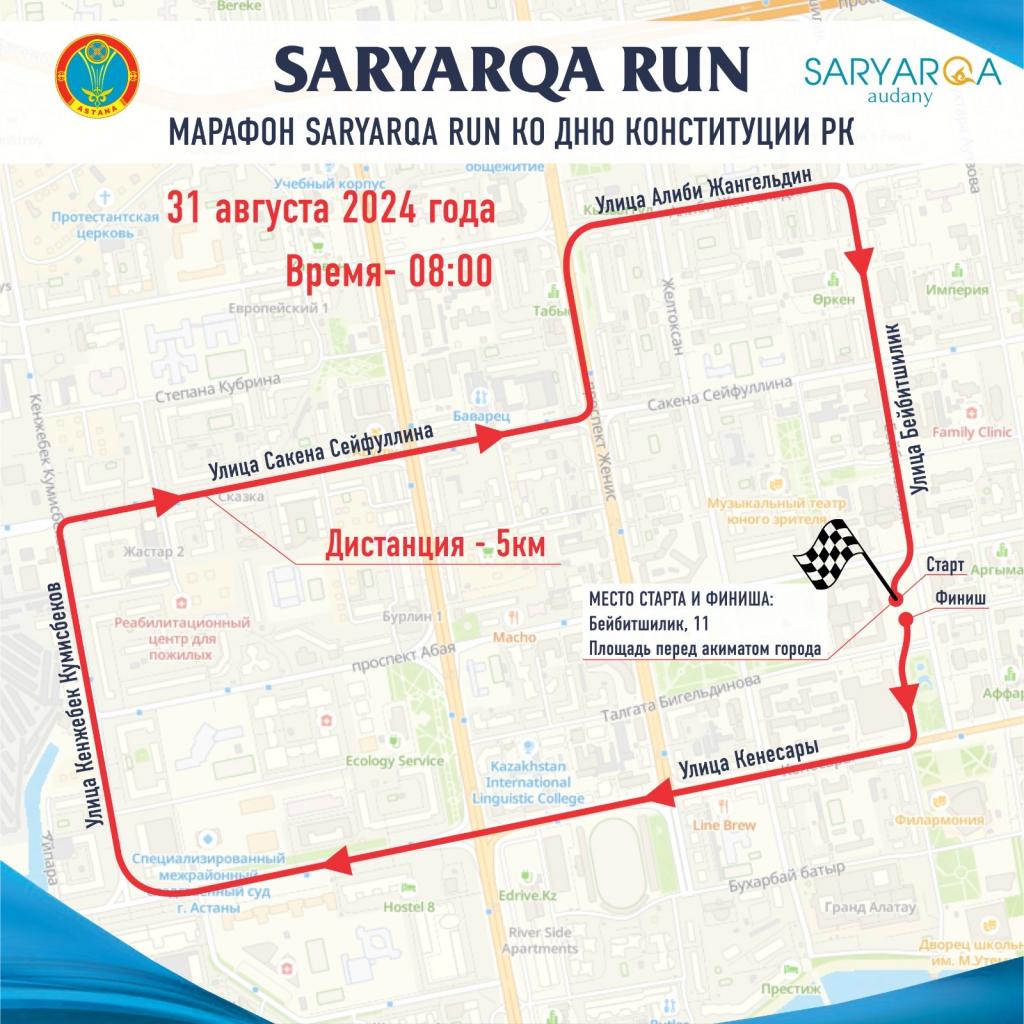 Старт состоится на городской площади перед акиматом города (ул. Бейбитшилик, 11). Общая дистанция забега – 5 км.