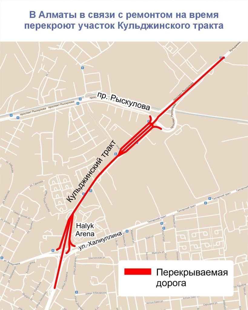 Так, с 23.00 23 августа до 07.00 25 августа движение будет перекрыто на участке от транспортной развязки Рыскулова — Кульджинский тракт до транспортной развязки Халиуллина — Кульджинский трак.