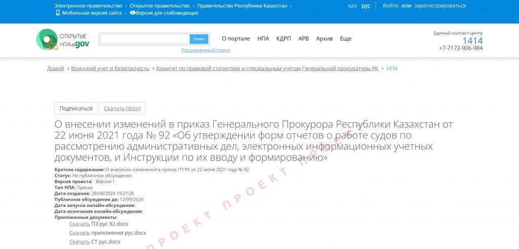 28 августа 2024 года на интернет-портале открытых данных был размещен проект приказа Генерального Прокурора Республики Казахстан, направленный на внесение изменений в приказ от 22 июня 2021 года № 92. Этот приказ регулирует формы отчетов о работе судов по рассмотрению административных дел, а также электронные информационные учетные документы и инструкции по их вводу и формированию.