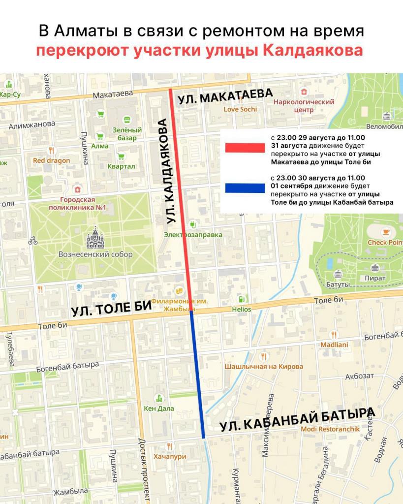 Так, с 23.00 29 августа до 11.00 31 августа движение будет перекрыто на участке от улицы Макатаева до улицы Толе би.